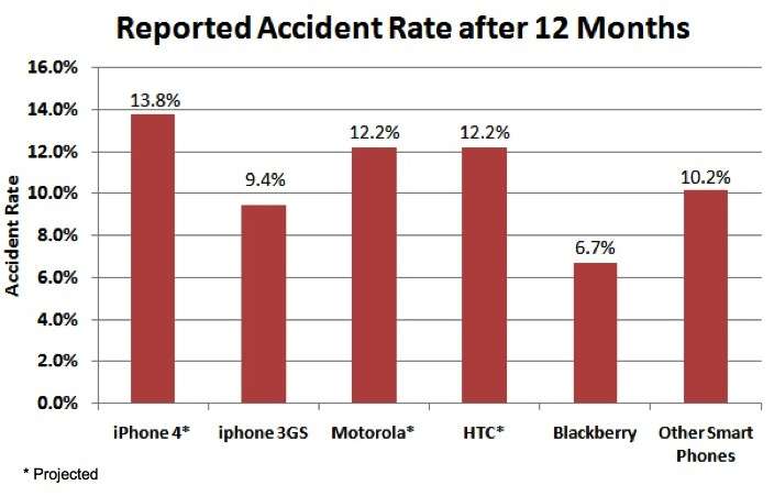 Ricerca SquareTradeLo studio ha rivelato che l'iPhone 4 è lo smartphone più affidabile con solo il 2.1 per cento dei proprietari che hanno avuto un malfunzionamento non dovuto ad incidente nei primi 12 mesi. A seguire, con il 2.3 per cento ci sono l'iPhone 3G S e Motorola.Anche se l'iPhone ha ottenuto ottimi risultati in affidabilità è risultato essere il più soggetto ad incidenti riportando un tasso di rottura del 13.8 per cento nei primi 12 mesi. Essendo ricoperto su entrambi i lati da vetro, lo smartphone di Apple è anche più soggetto a rotture in caso di cadute.Più resistenti i BlackBerry con un tasso di rottura per incidente nei primi 12 mesi di solo 6.7 per cento.