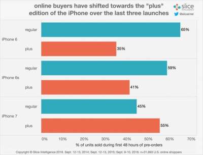 Sul totale dei preordini, il 55% riguardano l'iPhone 7 Plus, mentre il restante 45% è appannaggio di iPhone 7, ad ulteriore testimonianza della crescente importanza dei phablet sul mercato della telefonia. Guardando agli anni passati, la variante "Plus" di iPhone ha sempre fatto registrare numeri inferiori rispetto alla variante "classica": il 6 Plus al 35% del totale dei preordini, mentre il 6s Plus al 41%. È dunque evidente che le pecularità hardware del 7 Plus (zoom ottico 2x e doppia fotocamera posteriore) hanno maggiormente impressionato gli utenti rispetto all'iPhone 7, senza dimenticare ovviamente il display da 5,5 pollici contro i 4,7 del fratello minore.