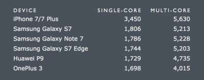 Sono soprattutto i punteggi in single-core a sbaragliare la concorrenza: ben 3.450 punti valgono al melafonino un distacco incolmabile dal secondo in classifica (il Samsung Galaxy S7 a 1.806 punti) e dal Galaxy Note 7, lanciato come lo smartphone «non plus ultra» dai sudcoreani di Samsung (1.786 punti).
