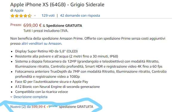 iPhone XS in sconto è disponibile a questo indirizzo, ma assicurati di scegliere il modello venduto e spedito da Amazon, quindi comprensivo di spedizione gratuita e copertura garantita dai servizi Prime.