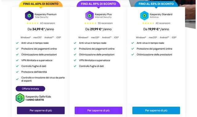 Apri dunque la pagina ufficialee scopri le soluzioni Kaspersky più adatte alle tue esigenze. Puoi avere sconti che arrivano fino al 60%: non tardare.