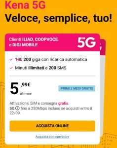 Il costo mensile resta fisso a 5,99€, senza sorprese o aumenti improvvisi, il che la rende particolarmente interessante per chi vuole tenere sotto controllo la spesa telefonica. Uno degli aspetti più importanti è la rete su cui si appoggia Kena Mobile, ovvero quella di TIM, che garantisce una copertura ampia e stabile su tutto il territorio italiano. Dove disponibile il 5G, la navigazione risulta veloce e fluida, adatta anche allo streaming e all’uso intenso dei social o delle app. In pratica, puoi utilizzare lo smartphone in modo completo senza dover continuamente controllare il consumo dei dati. Un altro punto di forza è la semplicità. L’attivazione della SIM avviene interamente online e richiede pochi minuti. Puoi scegliere tra SIM fisica o eSIM, a seconda delle tue esigenze, e completare la procedura senza recarti in negozio. Anche la portabilità del numero è gestita automaticamente, quindi puoi cambiare operatore senza complicazioni o interruzioni del servizio. La Kena Mobile da 5,99€ è una delle offerte low cost più competitive del momento, grazie al mix tra prezzo molto basso, tanti giga e attivazione semplice. Una proposta pensata per chi vuole risparmiare senza rinunciare a una connessione completa e affidabile.