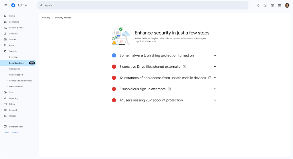 Di cosa si tratta? “Consideralo come il tuo esperto di sicurezza personale in grado di offrire approfondimenti personalizzati per l’azienda, indicazioni pratiche e controlli aggiuntivi di prevenzione delle minacce e protezione dei dati”, spiega l’azienda di Mountain View. Tradotto in poche parole, è un potente toolkit pensato per contrastare tutte le ultime minacce informatiche tramite l’implementazione di misure di sicurezza mirate.