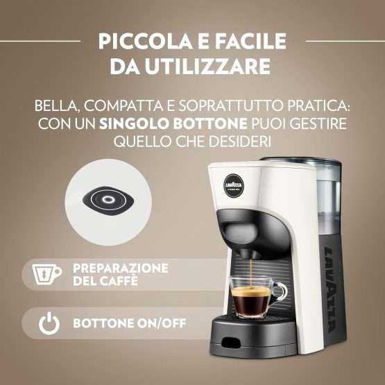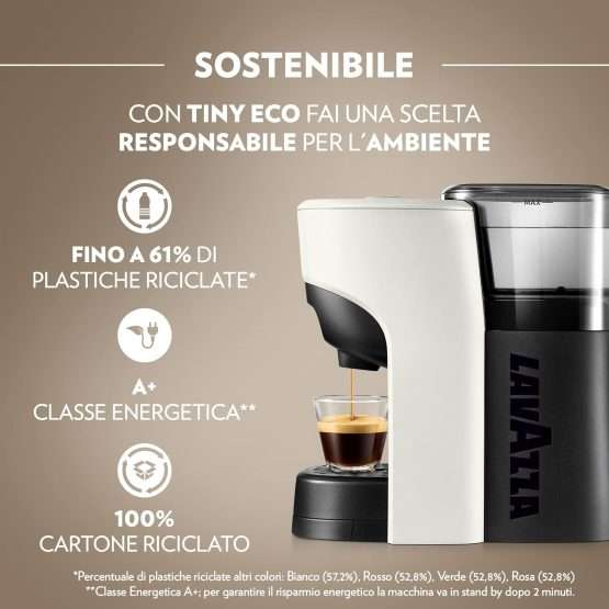 Piccola di dimensioni ma con tutto il potenziale necessario per darti la spinta che ti serve. Lavazza Tiny eco è la macchinetta che metti in cucina o in ufficio e di cui non fai più a meno. Dal design accattivante ti permette di avere una tazzina di caffè perfetta ogni volta che vuoi.