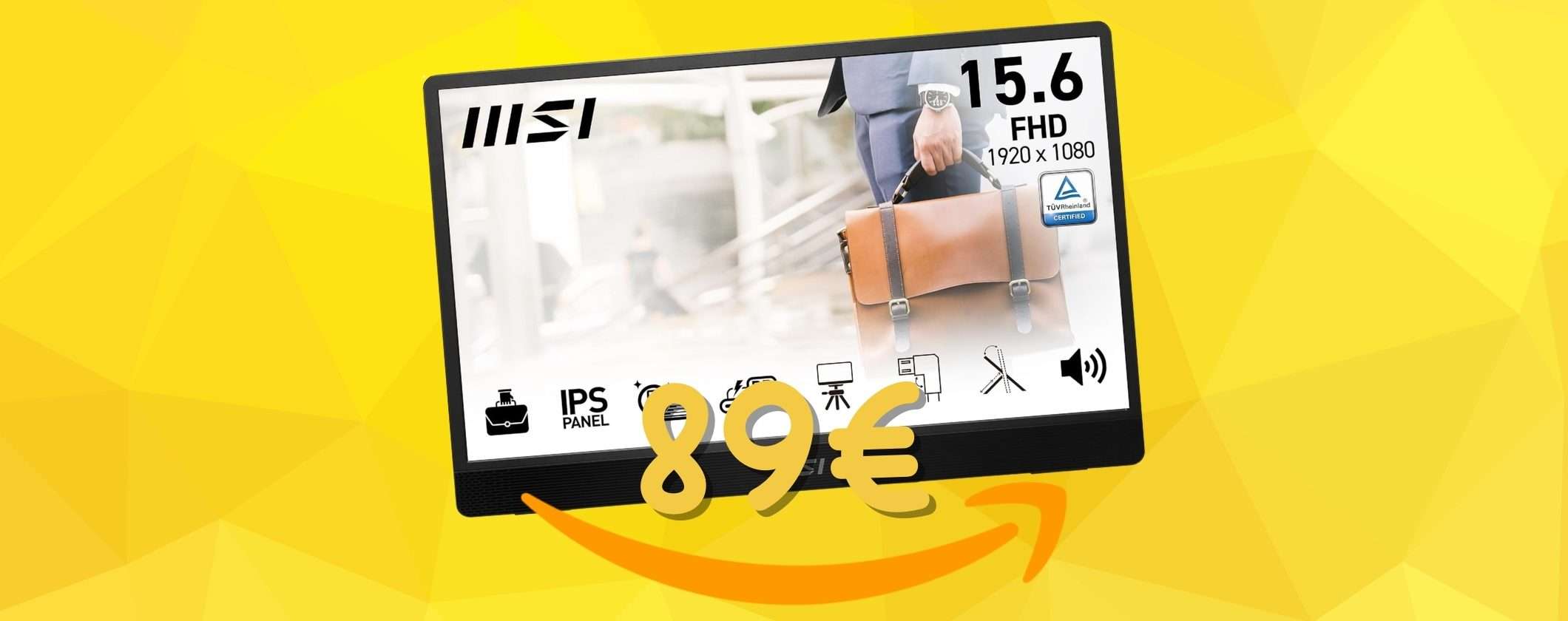 Se ti capita molto spesso di essere fuori casa per lavoro e quindi hai bisogno di uno schermo bello grande per lavorare al computer dai un’occhiata a questa promozione. Se vai immediatamente su Amazon puoi accaparrarti l’utilissimo monitor portatile MSI PRO da 15,6 pollici a soli 89,99 euro, invece che 139,99 euro.