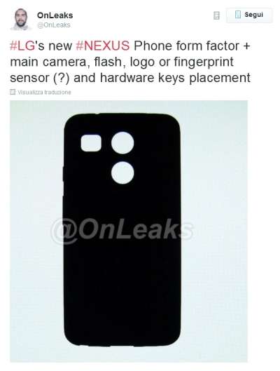 Entro la fine dell’anno, Google dovrebbe lanciare due nuovi smartphone Nexus: uno realizzato da Huawei e un altro realizzato da LG. Il Nexus versione LG non dovrebbe essere basato sul G4 e dovrebbe integrare una doppia fotocamera 3D, un lettore di impronte digitali e Android M. A parte queste informazioni, già trapelate nei giorni scorsi, spunta ora un'immagine davvero interessante che, secondo colui che l'ha pubblicata, il noto OnLeaks, mostra la parte posteriore del nuovo LG Nexus.