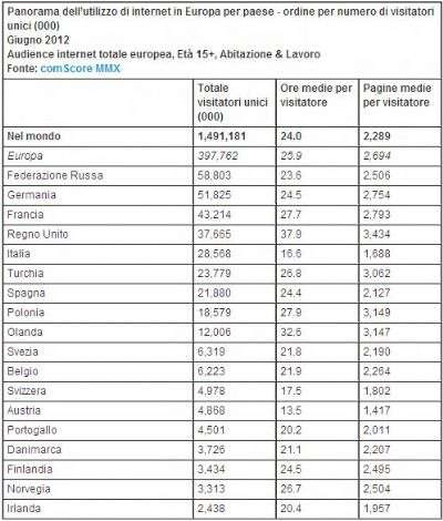 comScore ha diffuso oggi il quadro sull’utilizzo di internet in Europa durante il mese di Giugno 2012: 397,2 milioni di europei si sono collegati a internet per una durata media di 25,9 ore.
