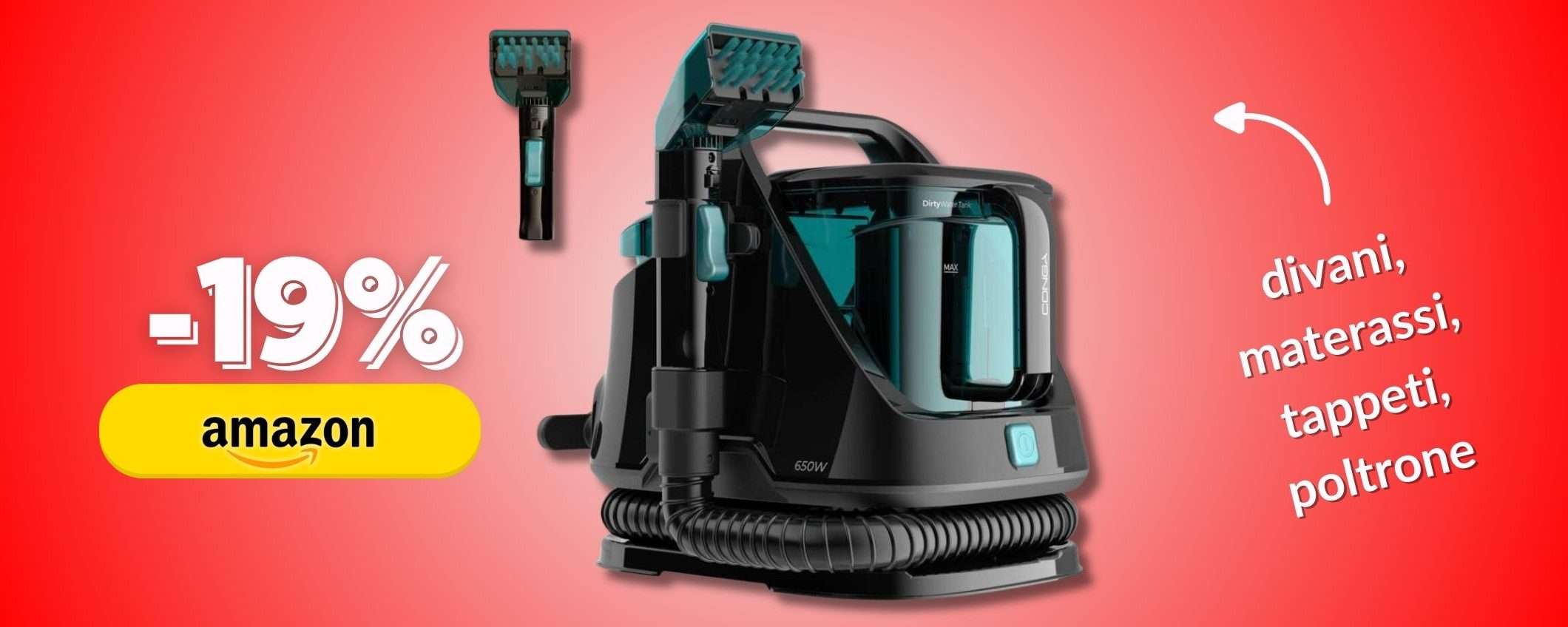 Prenditi cura della tappezzeria in casa senza diventare matto. Quando si parla di pulizia di materassi, divano, poltrone e tappeti non si sa mai come fare o non si hanno i giusti prodotti a disposizione. Ma se ti dicessi che con meno di €100 risolvi tutti i problemi? Tutto merito del Conga 5000 Carpet&Spot Clean XXL, un sistema di pulizia Cecotec facile da utilizzare e soprattutto efficace. Puoi acquistarlo a soli 99,98€ su Amazon approfittando di uno sconto del 19% che fa abbassare il prezzo al punto giusto.