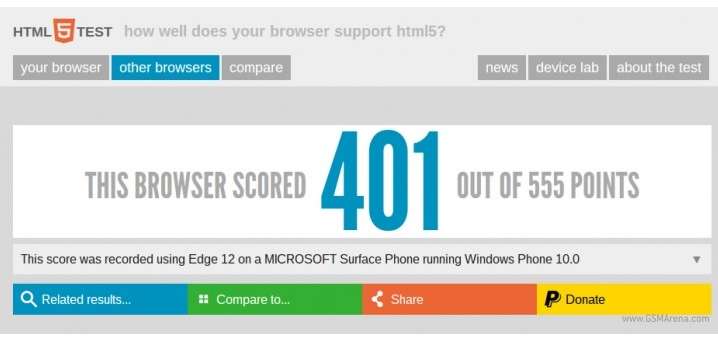 L’indiscrezione che Microsoft sia al lavoro su un Surface Phone non è certo nuova, anche se adesso spuntano nuovi indizi che sembrerebbero confermare la notizia. Il perché è presto detto: un dispositivo mobile che porta il nome di Microsoft Surface Phone è stato recentemente testato dal benchmark HTML5test tramite il browser Edge 12. Il punteggio ottenuto? 401 punti su un totale di 555.