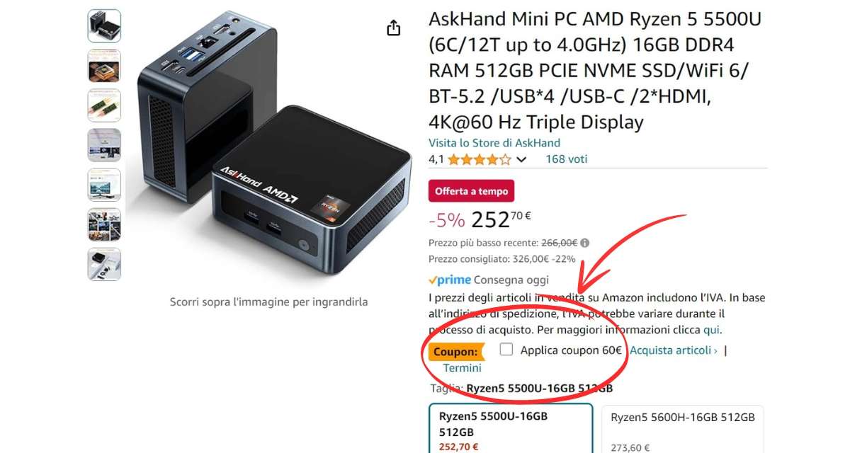 Sei alla ricerca di un computer piccolo, che puoi volendo trasportare facilmente, ma che garantisca ottime prestazioni e non costi troppo? Non preoccuparti, non hai troppe pretese. Vai subito su Amazon e metti nel tuo carrello questoMini PC con Ryzen 5 a soli 192,70 euro, invece che 326 euro. Per averlo a questo prezzo applica il coupon che puoi vedere in pagina.