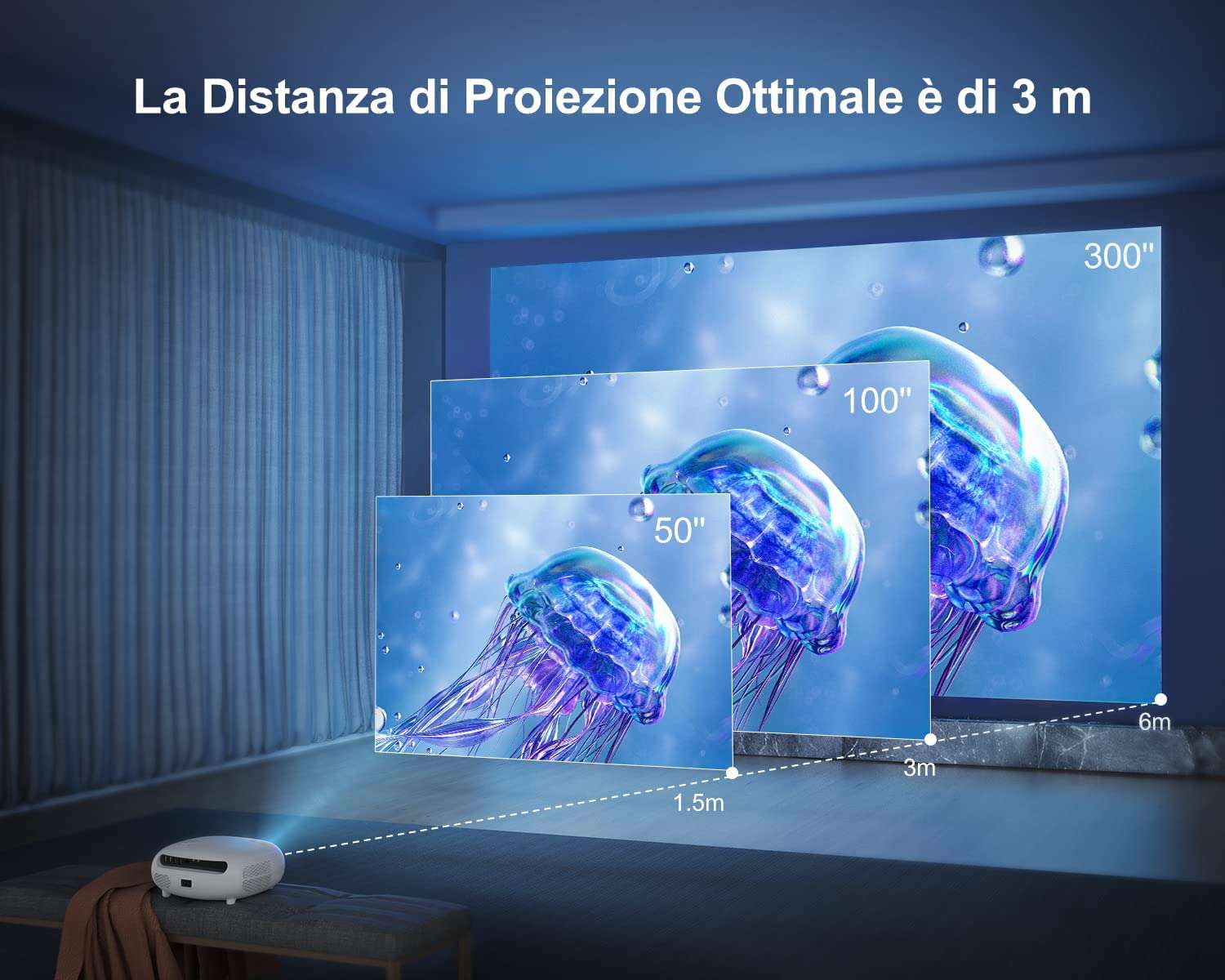 Questo mini proiettore WiFi ha un design compatto e leggero, così lo puoi portare dove vuoi. Lo infili in un piccolo zaino e in un secondo ogni parete diventa lo schermo del cinema. Volendo lo puoi anche attaccare al soffitto con l’apposito supporto che trovi in confezione. È dotato della tecnologia Bluetooth per cui puoi collegarci qualsiasi dispositivo e supporta una risoluzione 4K. Ogni contenuto video prenderà vita. Grazie ai 9800 lumen e un rapporto di contrasto di 16000:1, potrai vedere ogni dettaglio con colori intensi e vividi.