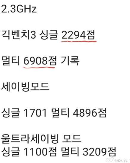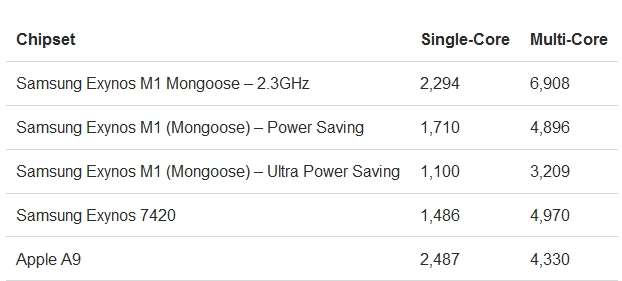 Facendo riferimento ad una immagine pubblicata su Weibo, il nuovo processore Exynos con core Mongoose è stato testato ad una frequenza di 2,3 GHz e ha fatto segnare 2.294 punti nel test single-core e 6.908 punti nel test multi-core di GeekBench. Quando il processore è stato testato in modalità di risparmio energetico, ha fatto segnare 1.710 punti nel test single-core e 4.896 punti nel test multi-core. Impostato invece in modalità energetica Ultra Power, il chipset ha segnato 1.100 punti e 3.209 punti, rispettivamente nei test single-core e multi-core.