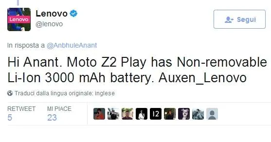 Ultimamente, rispondendo a una domanda fatta poche ore fa da un utente su Twitter, Lenovo ha parlato del Moto Z2 Play, uno smartphone che dovrebbe sostituire l’originale Moto Z Play rilasciato l'anno scorso. L'unica cosa che la società ha rivelato sul Moto Z2 Play, che smentisce il dato rilasciato dalla certificazione TENAA, è che il device avrà una batteria al litio da 3.000 mAh non rimovibile.