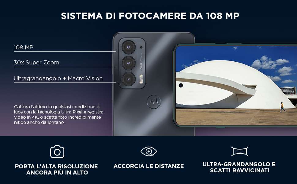 Il terminale vanta la presenza di un display OLED da 6,7 pollici e risoluzione FullHD+, con HDR10 e frequenza d’aggiornamento fino a 144 Hz per la massima fluidità. Il modulo fotografico posteriore include un sensore da 108 MP con Super Zoom 30x, Ultragrandangolo e Macro Vision, per scatti incredibilmente nitidi e video in 4K. A bordo del Motorola Edge 20 5G troviamo 128GB di storage interno e 6GB di memoria RAM, oltre ad una batteria da 4000mAh di lunga durata e con sistema di ricarica rapida. Goditi i migliori contenuti multimediali del web grazie alla connettività 5G ultraveloce ed al Wi-Fi 6E.