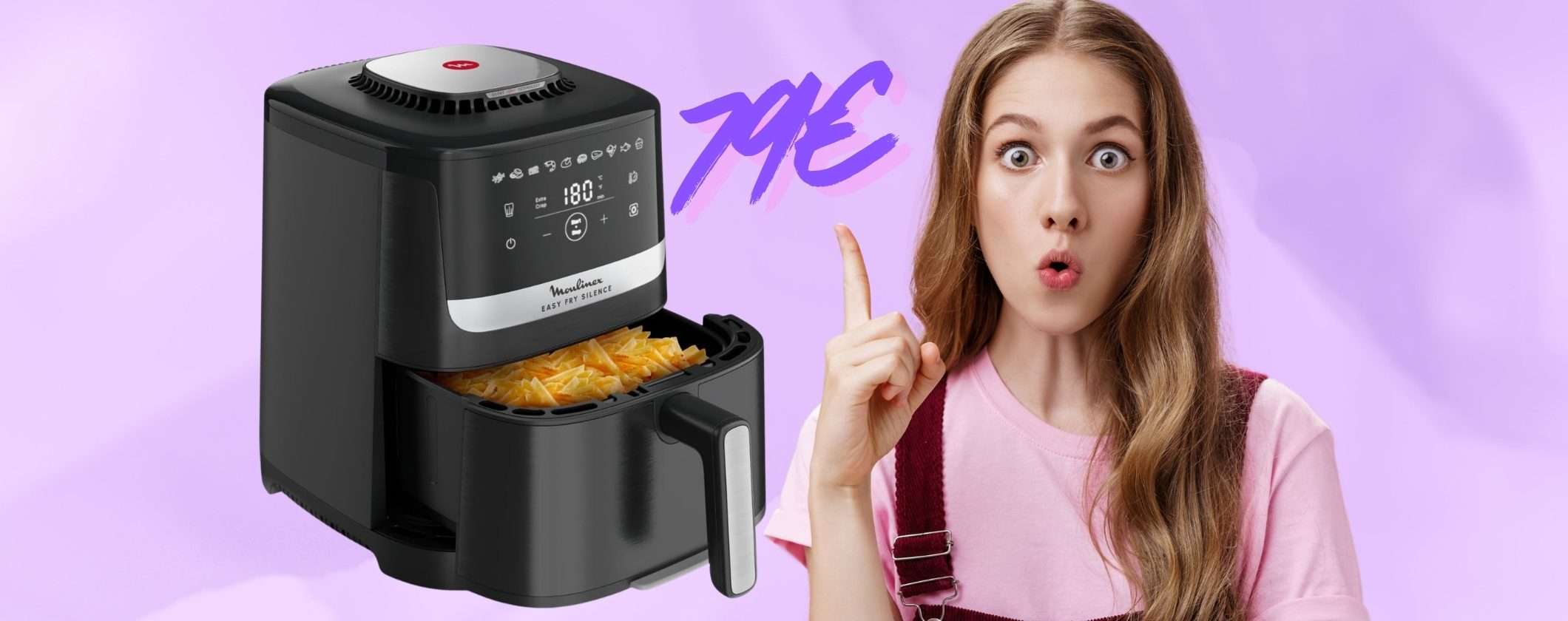 Oggi abbiamo deciso di segnalarti questa promozione che ti permetterà di acquistare una friggitrice ad aria eccezionale a un ottimo prezzo. Dunque vai immediatamente su Amazon e metti nel tuo carrello la Moulinex Easy Fry Silence a soli 79,98 euro, invece che 139,99 euro.