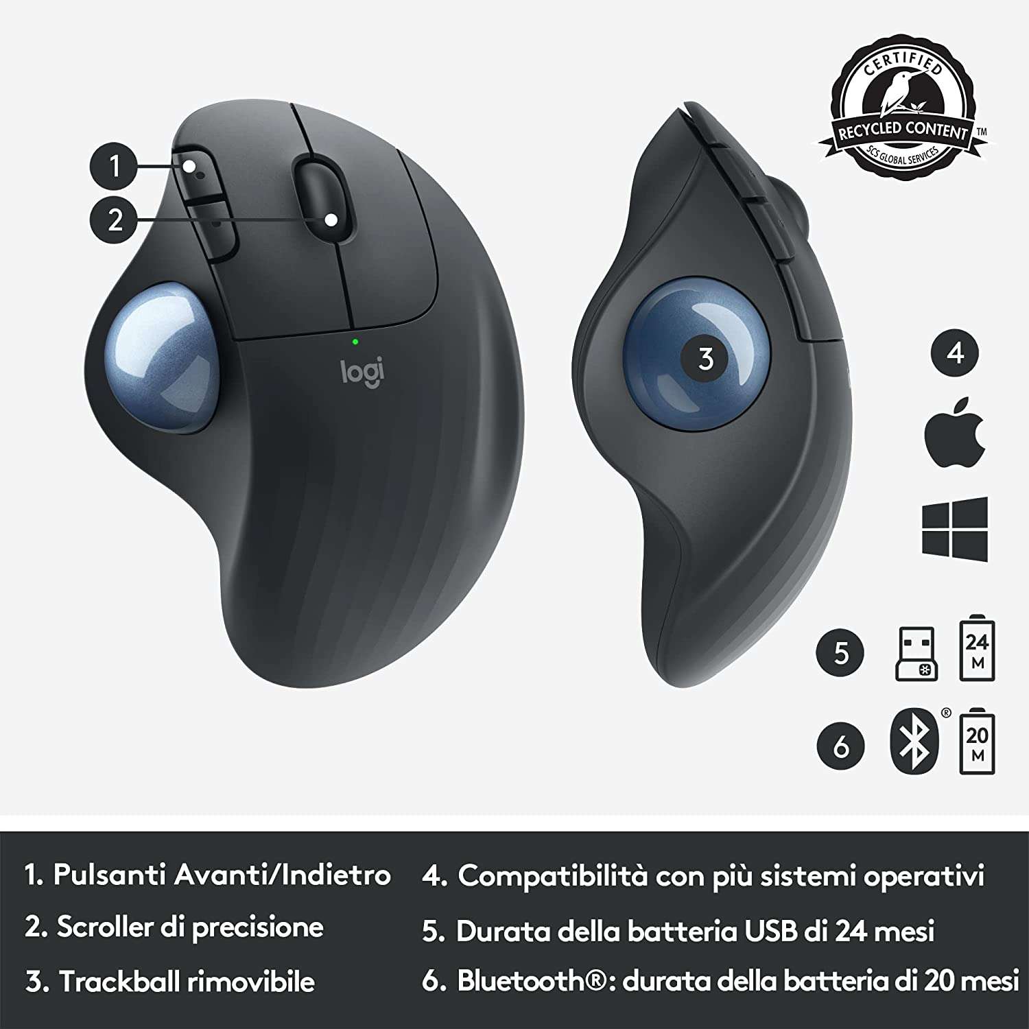 Fino a 10 mt di raggio d’azione scegliendo se sfruttare la tecnologia Bluetooth, oppure se usare il ricevitore USB già presente nella confezione. Pratico da usare anche negli spazi stretti, grazie alla trackball, che permette di muovere il cursore senza spostare il braccio.