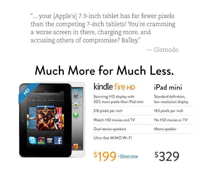 Secondo Amazon, quindi, il suo Kindle Fire HD offre "molto di più", rispetto ad iPad mini di Apple spendendo "molto di meno". Lo slogan è accompagnato da un’immagine del tableti di Amazon che "nasconde" un iPad mini alle sue spalle. Accanto ci sono le specifiche tencniche a confronto ed i prezzi di vendita al pubblico: 199 dollari contro 329 dollari.
