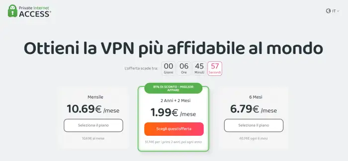In questo articolo spiegheremo nel dettaglio perché questo servizio è un vero portento, ma prima vogliamo porre l’accento sull’offerta con cui viene attualmente proposto. PIA VPN è in sconto dell’80% al prezzo di 1,99€ al mese per il piano biennale, con 2 mesi extra di sconto.