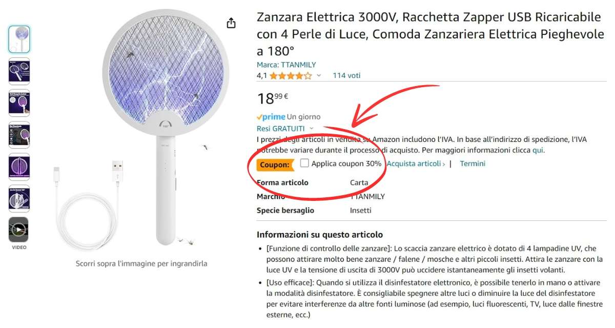 Le zanzare ormai stanno arrivando per cui corri immediatamente ai ripari. Vai subito su Amazon e acquista la tuaracchetta elettrica a soli 13,29 euro, invece che 18,99 euro. Per averla a questa cifra ricordati di applicare il coupon in pagina. Concludi adesso il tuo ordine e la riceverai a casa già domani senza ulteriori costi. Solo per i clienti Prime. Se non sei ancora iscritto al servizio fallo ora cliccando qui.