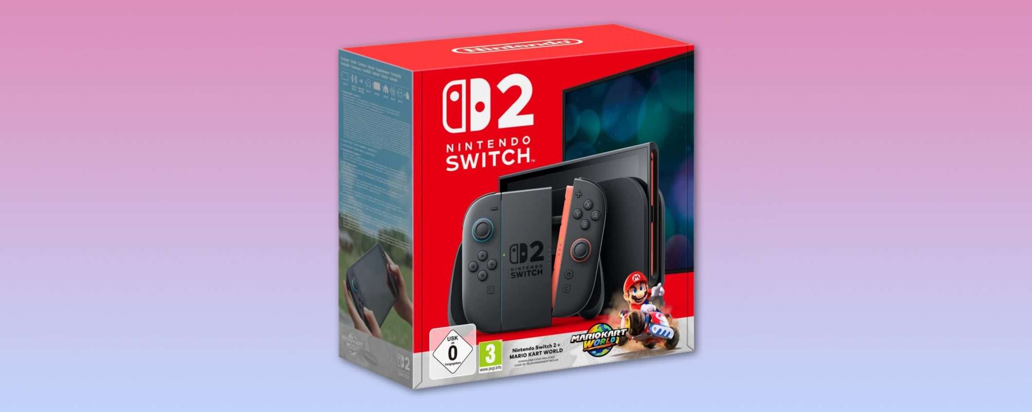 La console include Joy-Con 2 sinistro e destro, i laccetti, l’impugnatura Joy-Con, oltre alla base dock per la TV, il cavo HDMI ad altissima velocità e l’alimentatore. Il bundle include anche Mario Kart World in versione digitale, uno dei primi titoli esclusivi per Nintendo Switch 2.