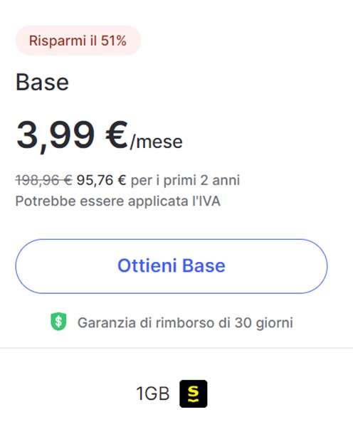 Se si è interessati soltanto al servizio VPN, è comunque ottimo anche il piano più economico (quello Base), al momento in offerta a 3,99 euro al mese invece di 8,29 euro, con in più 1 GB per navigare all’estero con l’app Saily. Trovi tutti i dettagli dell’offerta su questa pagina del sito ufficiale di NordVPN.