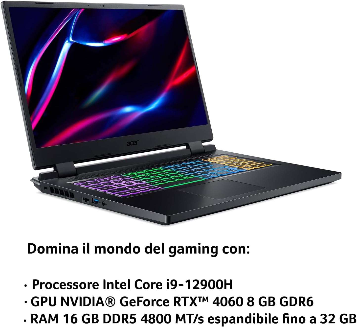 Con Acer Nitro 5 è possibile acquistare un notebook da gaming davvero potente. Tra le specifiche troviamo il processore Intel Core i9-12900H affiancato da 16 GB di memoria RAM e 1 TB di SSD. Da notare anche un display da 15,6 pollici, con risoluzione Full HD e refresh rate di 144 Hz.