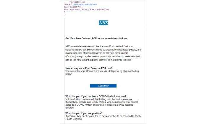 Parafrasando, il contenuto comunica che la nuova variante Covid-19 Omicron richiede l’acquisto di nuovi kit test. Ovviamente l’informazione è completamente falsa, ma serve per portare a compimento la truffa, ovvero l’acquisto di tale kit sponsorizzato in una pagina web identica a quella del National Health Service, raggiungibile dal link indicato nel corpo della mail.