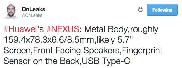 Secondo OnLeaks, il Nexus prodotto da Huawei dovrebbe essere caratterizzato da un corpo in metallo dalle dimensioni di 159,4 x 78,3 x 6,6/8,5 millimetri, display da 5,7 pollici di diagonale, altoparlanti frontali, sensore di impronte digitali sul posteriore e nuovo connettore reversibile USB 3.1 Type-C.