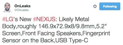 Non molto diverso anche il Nexus phone prodotto da LG : anche in questo caso si avrà un corpo in metallo, ma con display leggermente più piccolo (5,2 pollici di diagonale) e dimensioni di 146,9 x 72,9 x 8/9,8 millimetri. Nessuna novità per quanto riguarda il resto delle caratteristiche pubblicate: altoparlanti frontali, sensore di impronte digitali sul posteriore e connettore USB Type-C.