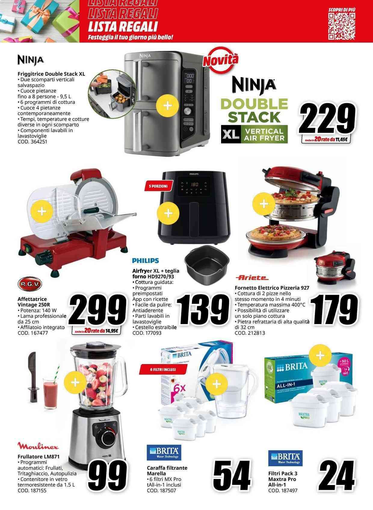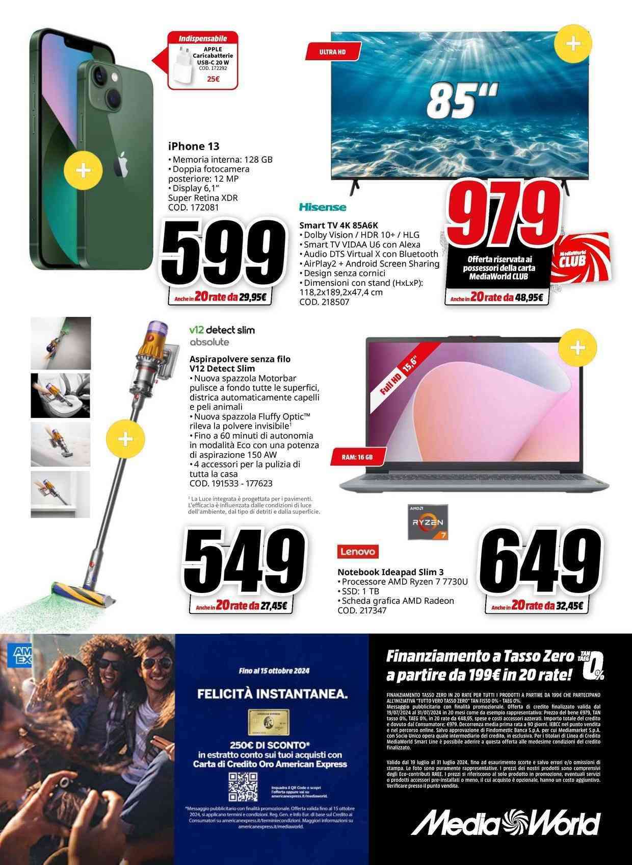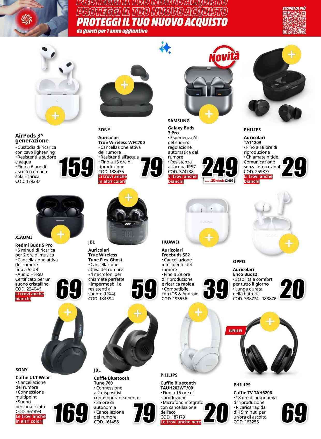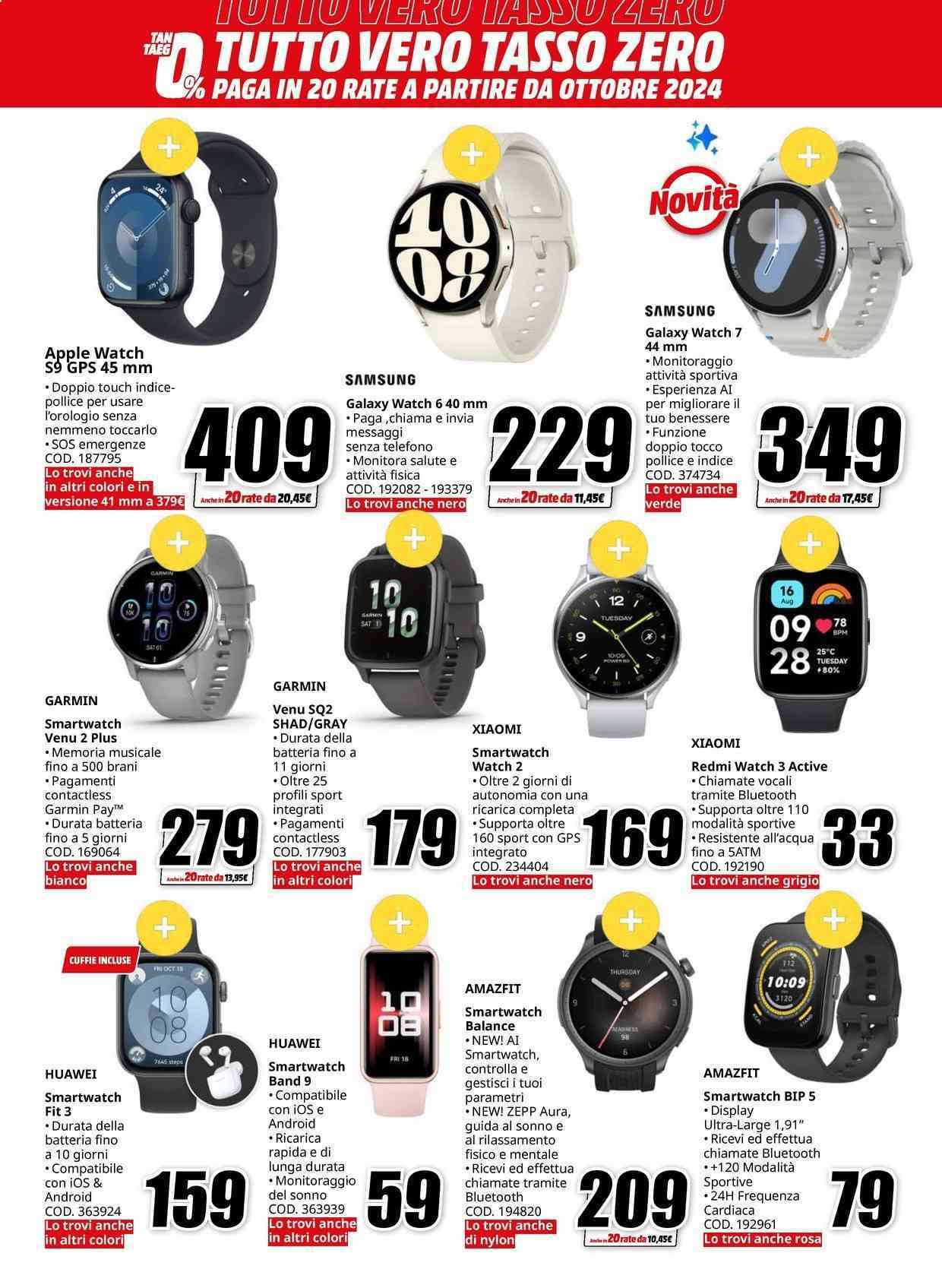 Non mancano gli smartwatch, auricolari e cuffie, tablet, stampanti, monitor, console, attrezzatura fotografica, smart TV, elettrodomestici e prodotti per la casa e la cura della persona. Ricordiamo che il volantino MediaWorld è valido fino al 31 luglio: se scegli l’opzione a rate a tasso zero, inizierai a pagare a ottobre 2024.