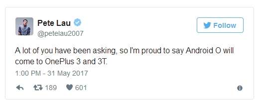 OnePlus 3 e OnePlus 3T verranno entrambi aggiornati ad Android O, la versione più recente del sistema operativo di Google. A darne notizia sul suo profilo Twitter è il fondatore e amministratore delegato di OnePlus, Pete Lau.