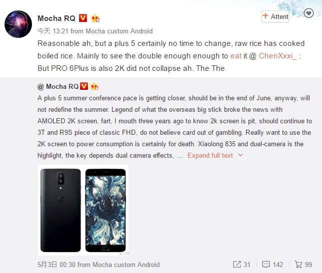 Per questo motivo, quindi, secondo il leakster, la società cinese ripiegherebbe su un display da 5,5 pollici con risoluzione Full-HD. Inoltre, il dispositivo sarebbe dotato di doppia camera posteriore e il suo rilascio avverrebbe a giugno. La presenza di dual cam sul retro dello smartphone era stata già anticipata da un ulteriore rumor messo in giro da Kumamoto Technology sempre su Weibo: il OnePlus 5 sarebbe dotato sul retro di una doppia camera disposta in senso orizzontale.
