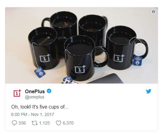 OnePlus è in procinto di annunciare il successore del OnePlus 5, top di gamma rilasciato nel mese di giugno, probabilmente chiamato OnePlus 5T o OnePlus 6. Apparentemente, il nome scelto sarà tuttavia il primo. Sembra rivelarlo un’immagine teaser pubblicata su Twitter poche ora fa che raffigura cinque tazze nere con il logo della società riempite con un liquido scuro. La frase a corredo recita: "Oh, guarda! Cinque tazze di…", probabilmente riferendosi al the, da cui l'iniziale T che farebbe propendere appunto per OnePlus 5T.