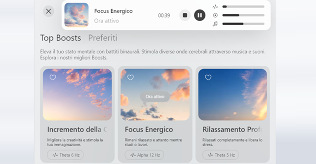 Un’altra caratteristica distintiva è il modulo “Boosts”, che sfrutta i battiti binaurali per influenzare l’attività delle onde cerebrali, contribuendo a migliorare la concentrazione, il rilassamento o la creatività a seconda delle necessità. Inoltre, le diverse opzioni di Boosts comprendono modalità come Rilassamento profondo, Focus energico e persino musica e suoni progettati per favorire la memoria e la concentrazione.
