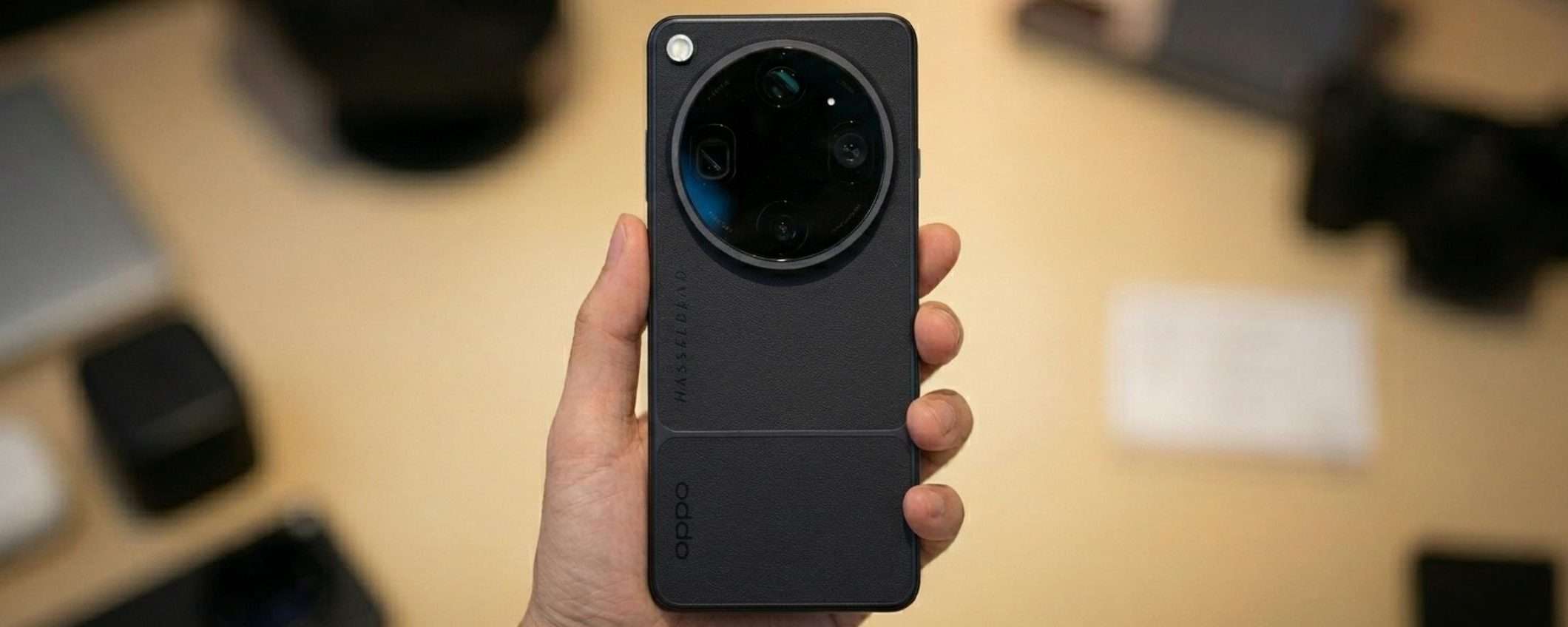 Rispetto ad altre immagini viste in precedenza, questo smartphone Oppo sembra avere una finitura diversa, con una specie di effetto pelle sul retro, accompagnato sia dal logo del brand che da quello Hasselblad. La scocca resta piatta, con bordi arrotondati, pensata per stare meglio in mano, anche se il modulo fotografico sporge parecchio.