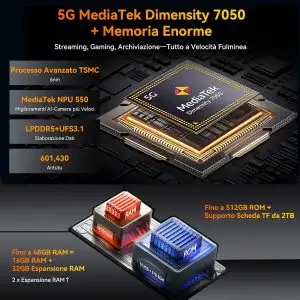 Sotto la scocca si nasconde però un’anima tecnologica di alto livello. Il cuore è il MediaTek Dimensity 7050 5G, un chip potente e bilanciato, affiancato da 48GB di RAM (16GB fisici + 32GB virtuali) e da 512GB di memoria interna UFS 3.1, espandibile fino a 2TB. Ciò si traduce in fluidità assoluta in qualsiasi circostanza, zero lag e tantissimo spazio per archiviare foto, video, mappe, app e qualsiasi altro file di grandi dimensioni.