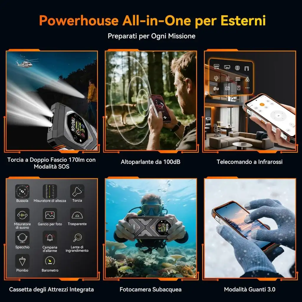 Abbiamo lasciato per ultimo, forse, la caratteristica più distintiva di questo smartphone, ovvero la batteria. Con i suoi 20.000mAh, il TANK 1 garantisce fino a 5 giorni di utilizzo intenso oppure oltre 40 ore di luce continua con la modalità torcia attiva. La ricarica rapida da 55W riduce drasticamente i tempi, mentre la funzione di reverse charging ti permette di alimentare altri dispositivi. Tutto questo con una gestione intelligente dei consumi che assicura prestazioni stabili anche con temperature difficili, comprese tra i -20°C ed i +60°C.