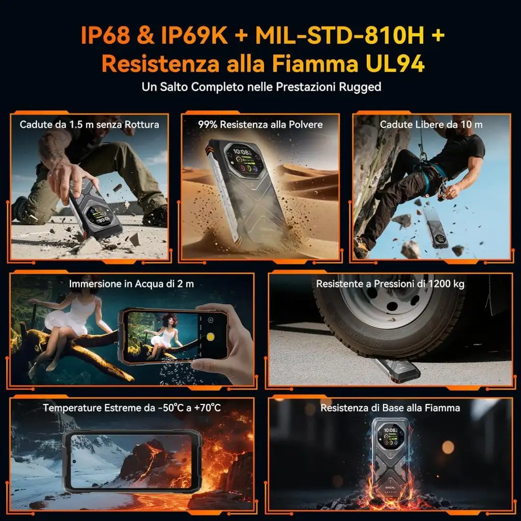 Il TANK 1 è davvero solido. La sua struttura, chiamata IronClad Shield, è certificata IP68/IP69K e MIL-STD-810H, quindi resistente ad immersioni fino a 2 metri, a cadute da 10 metri di altezza e perfino a pressioni di 1200kg max. È stato pensato per chi lavora in ambienti estremi, per chi ama l’avventura o semplicemente per chi vuole la tranquillità di avere in tasca un dispositivo indistruttibile e duraturo.