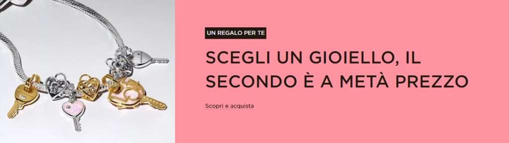 Grazie alla promozione Pandora ispirata a San Valentino, potrai ricevere uno sconto IMMEDIATO del 50% sul secondo gioiello acquistato. Come funziona? Basta aggiungere al carrello due gioielli inclusi nell’iniziativa (puoi visualizzare quelli aderenti a questo link) e il sistema applicherà automaticamente lo sconto. Il prodotto dal prezzo inferiore verrà scalato del 50% direttamente al checkout.