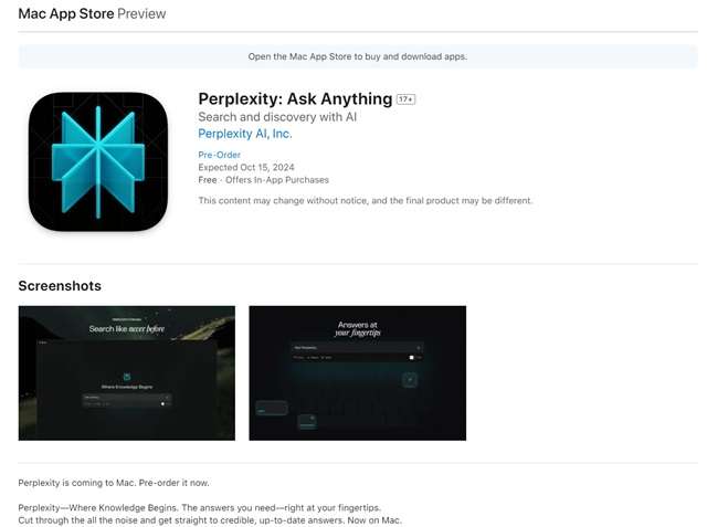 La data di lancio comunque esiste già: il debutto dell’applicazione nativa di Perplexity AI è infatti fissato per il prossimo 15 ottobre, come riporta la pagina dello store del Mac.