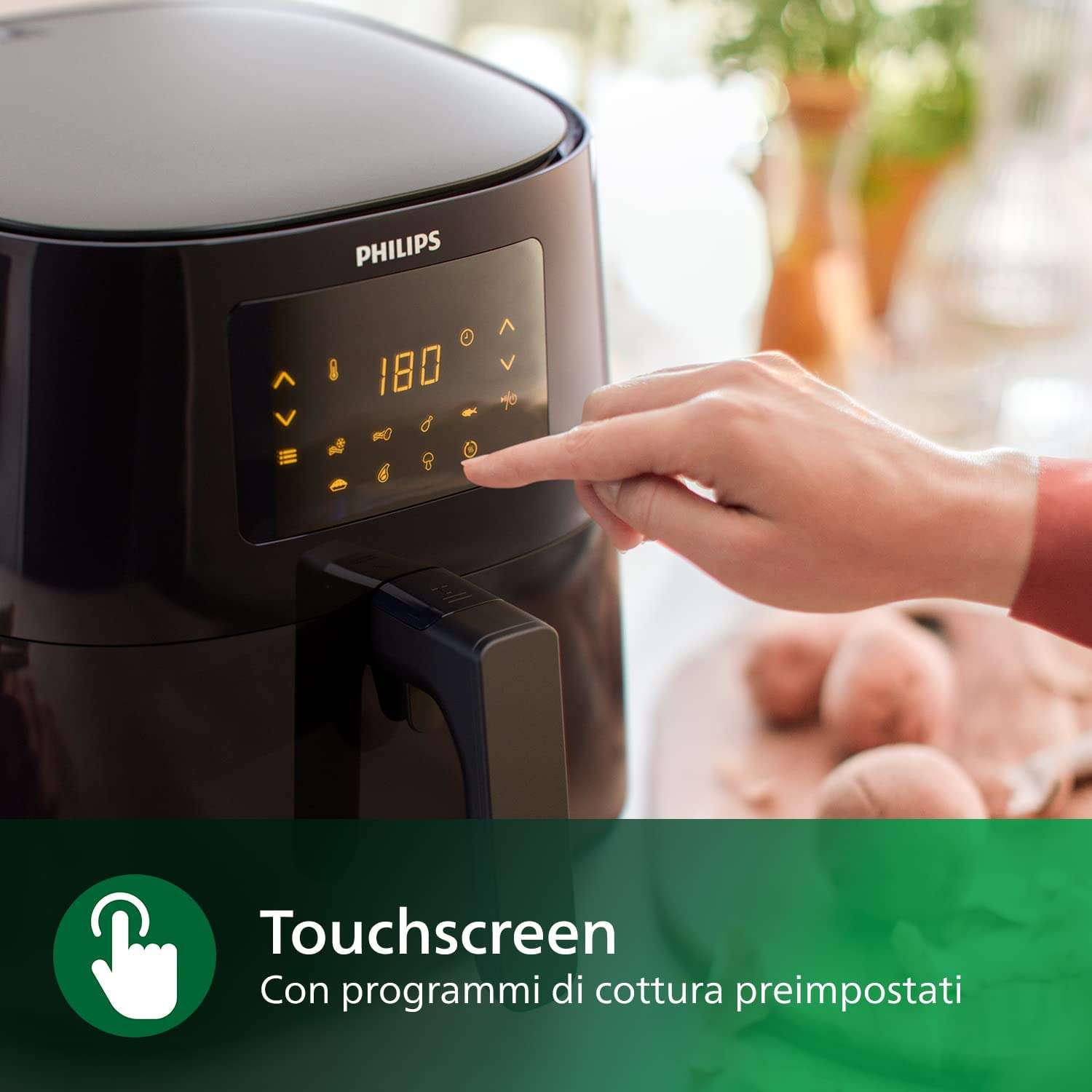 Splendido display touch per gestire la friggitrice, dove potrai scegliere tra 7 programmi di cottura preimpostati, oppure fare tutto manualmente. Grazie alla tecnologia Rapid Air che crea la perfetta circolazione dell’aria calda all’interno, riuscirai a cuocere i cibi in modo che siano morbidi dentro e croccanti fuori.