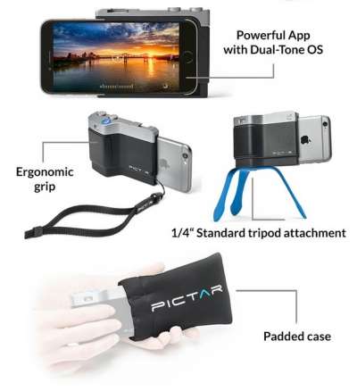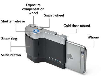 Al miglioramento di questa esperienza ora ci può pensare Pictar: un piccolo device realizzato da Miggo , una startup che produce accessori per le fotocamere di tipo DSLR. Pictar è un oggetto di tipo “companion”, ossia che non può funzionare da solo ma va necessariamente utilizzato in associazione con il device principale, cioè con lo smartphone; la sua principale funzione è portare le impostazioni di una fotocamera reflex su di un iPhone. Ha dimensioni abbastanza compatte e mutua la forma e i colori dall’impugnatura delle macchine fotografiche professionali. Come potete vedere dalla foto, si incastra sullo smartphone attraverso una slitta e permette all’utente di avere a portata di mano una serie di pulsanti fisici per interagire con le funzioni delle app fotografiche. Oltre al tasto “shutter” a due posizioni, che permette appunto lo scatto della fotografia, Pictar integra una rotella sulla parte frontale – da manovrare con l’indice della mano destra – che serve a zoomare e de zoomare, e altre due controlli a rotazione che servono per modificare l’esposizione e a selezionare il tipo di “scena” tra i vari preset (sport, controluce, scatto notturno, ritratto, panorama, ecc.). Per di più questi ultimi due controlli fisici possono anche essere ri-mappati a piacimento dall’utente.