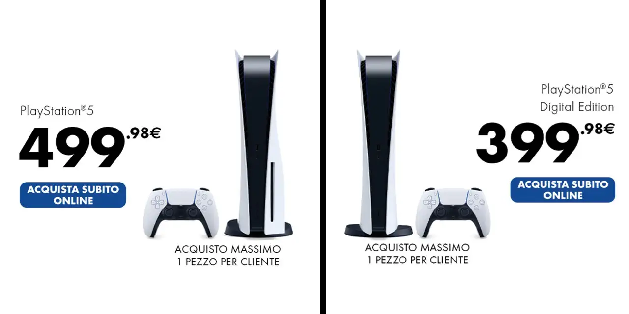 PS5 è disponibile in 2 differenti versioni, la Digital Edition è priva di lettore ottico e consente di acquistare i giochi soltanto in copia digitale, tramite lo store online di Sony, mentre la Standard Edition offre la possibilità di comprare i titoli sotto forma di disco.