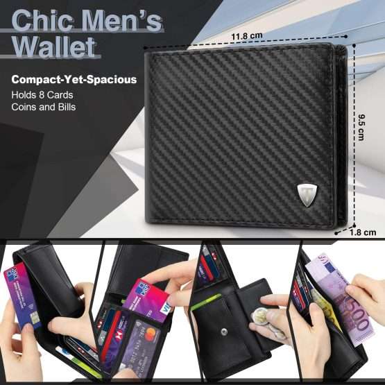Design slim ed eleganza unica per questo portafoglio Rfid realizzato in pelle di carbonio che nella tasca ti pesa poco ma tiene qualunque tuo dato al sicuro. Grazie alla schermatura Rfid di cui è dotato puoi scongiurare qualunque tipo di truffa. Non ne hai mai sentito parlare? Allora ti dico subito che si tratta un po’ di una tecnologia che funziona come uno scudo ma non ti preoccupare perché non ha bisogno che tu faccia qualcosa. Funziona sempre comunque e blocca i segnali esterni per impedire che qualcuno possa trafugare i dati dei tuoi documenti o delle tue carte di pagamento.