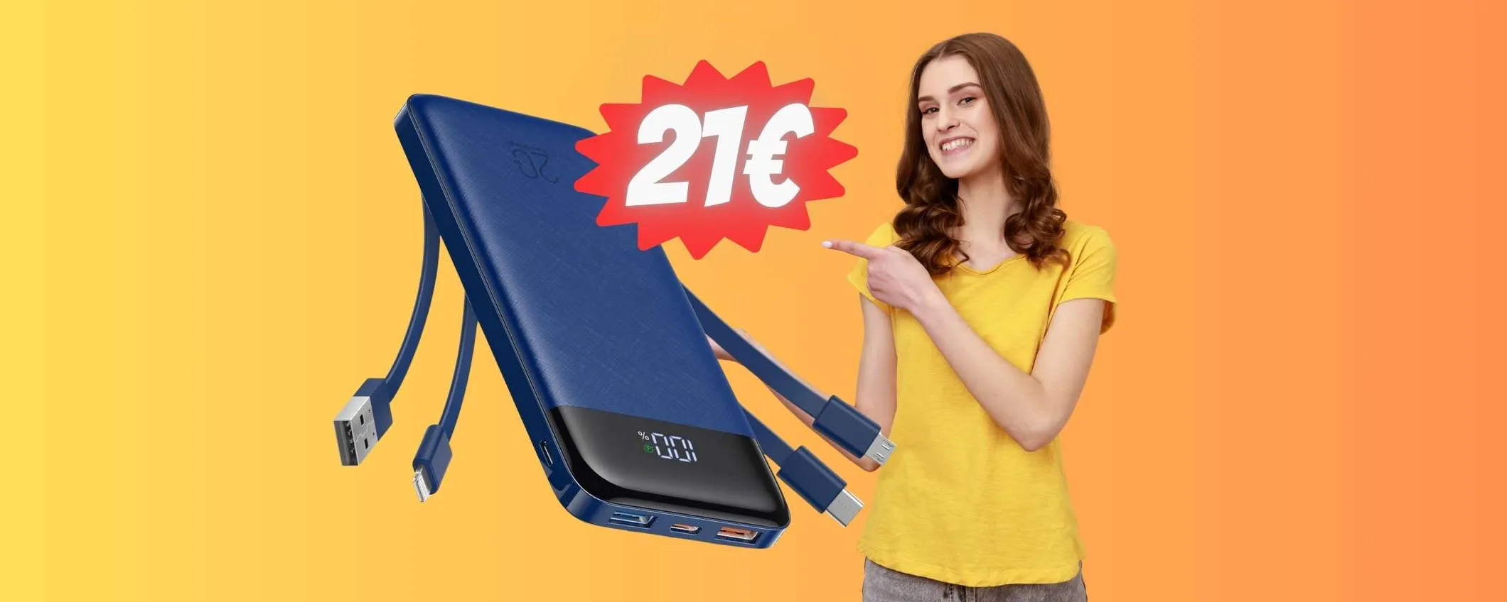 Uscire di casa con i tuoi dispositivi sempre carichi al 100% non è la cosa più semplice del mondo ed ecco perché abbiamo deciso di segnalarti questa ottima promozione. Se vai subito su Amazon puoi mettere nel tuo carrello questo Power Bank da 20000mAh con cavi integrati a soli 21,65 euro, invece che 29,99 euro.