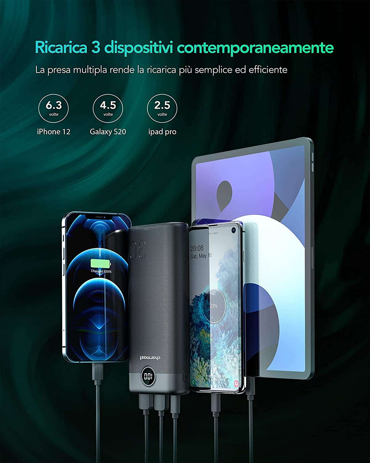 Sul mercato sono disponibili diverse tipologie di power bank, ognuna con specifiche capacità in termini di batteria. I modelli che permettono di collegare più apparecchi in contemporanea, però, sono davvero pochissimi ed offerti a prezzi tutt’altro che economici. Charmast è l’eccezione che conferma la regola: con una spesa minima avrai al tuo servizio una power bank con batteria da ben 30000mAh e sistema di ricarica rapida per donare energia a tutti i tuoi smartphone, tablet e non solo.