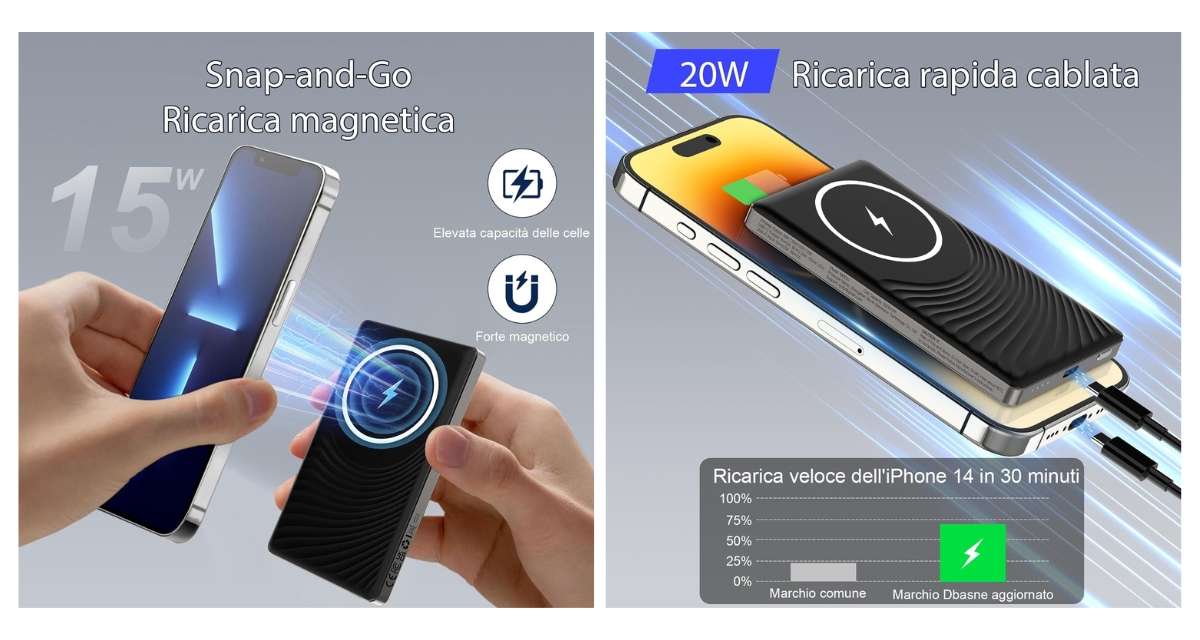 Se esci di casa con la batteria del tuo smartphone scarica non è un problema se possiedi un caricatore portatile come quello che ti sto segnalando adesso. Se vai su Amazon puoi mettere nel tuo carrello questo Power Bank magnetico wireless a soli 23,99 euro, anziché 99,99 euro. Per averlo a questo prezzo applica anche il coupon in pagina.