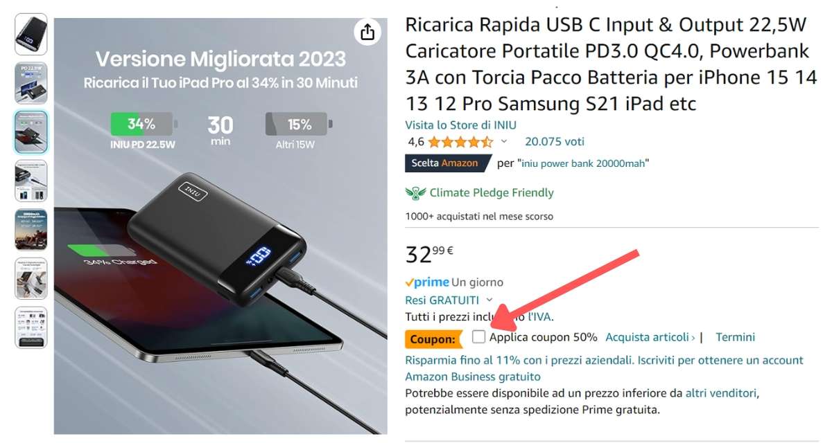 Fai in fretta perché difficilmente un’occasione così allettante potrà durare ancora tanto tempo. Quindi prima che sia tardi vai su Amazon e acquista il tuopower bank a soli 16,49 euro, invece che 32,99 euro, applicando il coupon in pagina. Se completi l’ordine adesso lo riceverai a casa tua già domani senza costi aggiuntivi, grazie ai servizi Prime. Se non sei ancora abbonato fallo ora cliccando qui.
