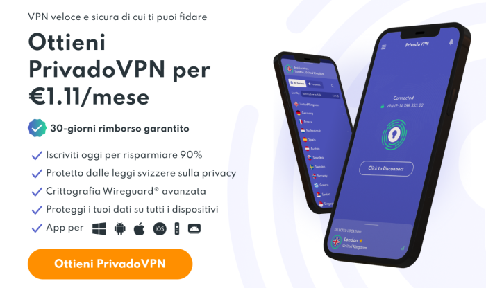 Il piano biennale ora costa 1,11 euro al mese grazie a uno sconto del 90%. L’offerta include anche tre mesi aggiuntivi gratuiti e una garanzia di rimborso valida per 30 giorni dall’attivazione. Ma vediamo nel dettaglio quali sono le funzionalità di PrivadoVPN.
