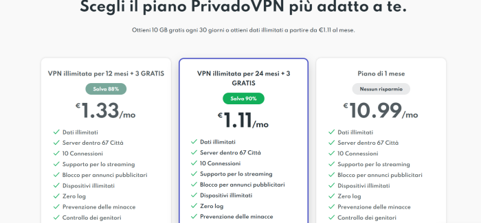 PrivadoVPN, uno dei tool di virtual private network migliori sul mercato, ha lanciato un forte sconto sul piano biennale. Grazie ad esso è possibile ottenere una VPN senza limiti a soli 1,11 euro al mese.
